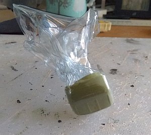 then with the mould forced into it and pulled tightly around it whilst still applying