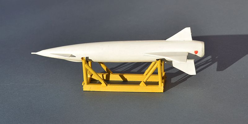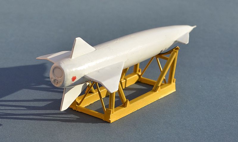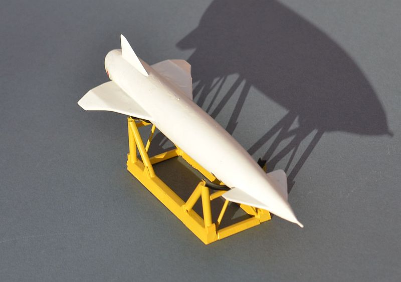 The cradle was scratch built from sprue to allow me to display the missile. It is not based on any accurate plans, although it is loosely similar to the raised maintenance/instruction cradle seen in the picture below. This missile and cradle used to accompany Vulcan XH558 to airshow displays.