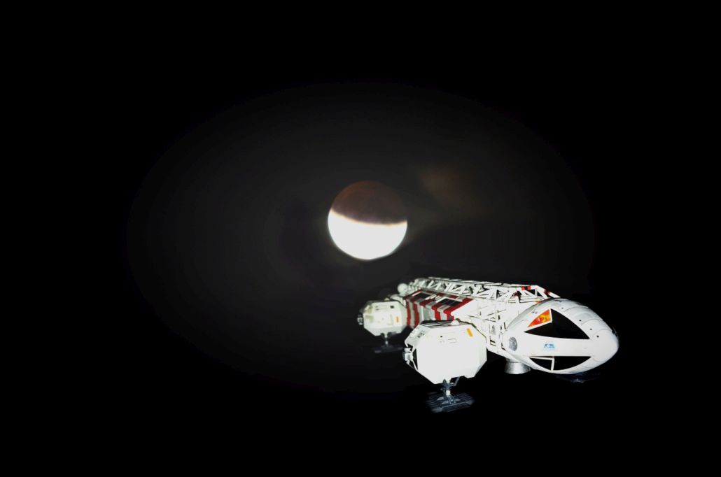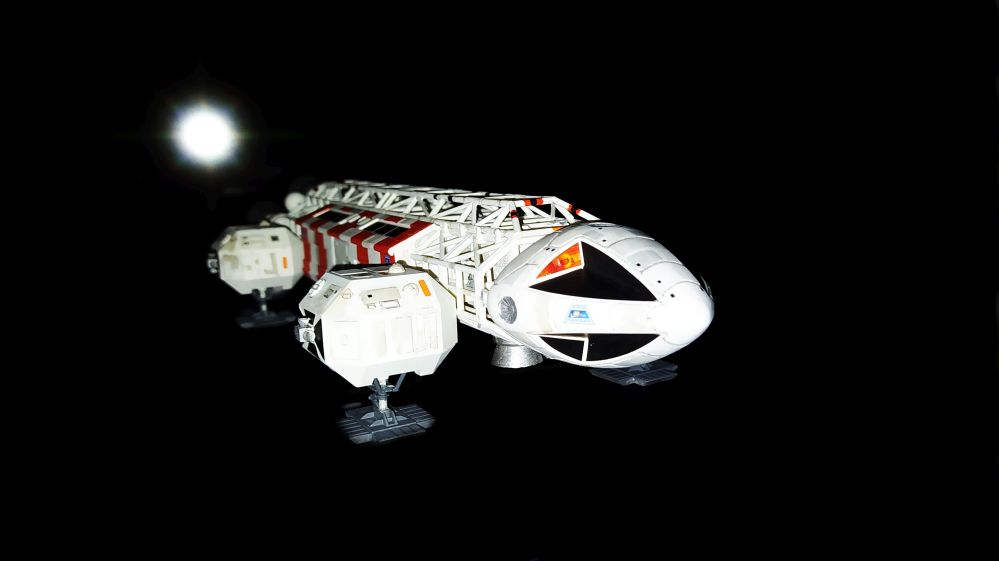 A little bit of fun brings the model to life. This and all the other “space” shots on this page were taken on my phone camera in front of my darkened TV screen in a room with the lights off, with either the reflection of the camera light, or a photoshopped moon added in the background !