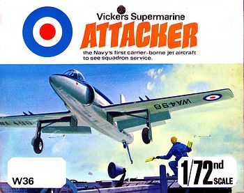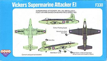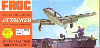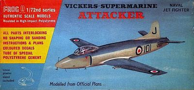 FROG's Supermarine Attacker kit was one of their earliest, first appearing in 1956 and seemingly with a remarkably long production run, with FROG until the late 1970s, then the NOVO and other USSR offshoots until the late 1990s and beyond! It really is a very basic kit, with only 14 parts and despite its claim to be "based on official plans" it isn't the most accurate around.