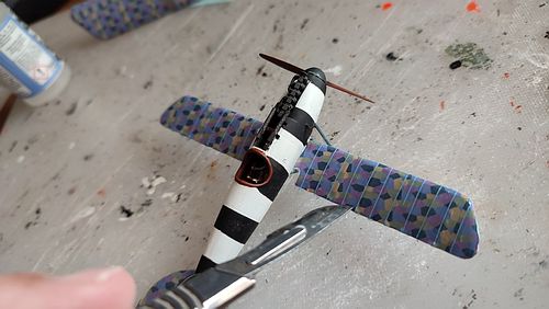Parts fit is generally good, although I had some difficulty attaching the lower wings to the fuselage and keeping them square with the fuselage axis. I hacked away some extra plastic until they were flush, then left the kit with a couple of jigs in place to try and keep the wings and the tailplane straight and level. The kit is missing the prominent cooling pipe that leads from the upper wing radiator to the front of the engine, so this was added from some wire.