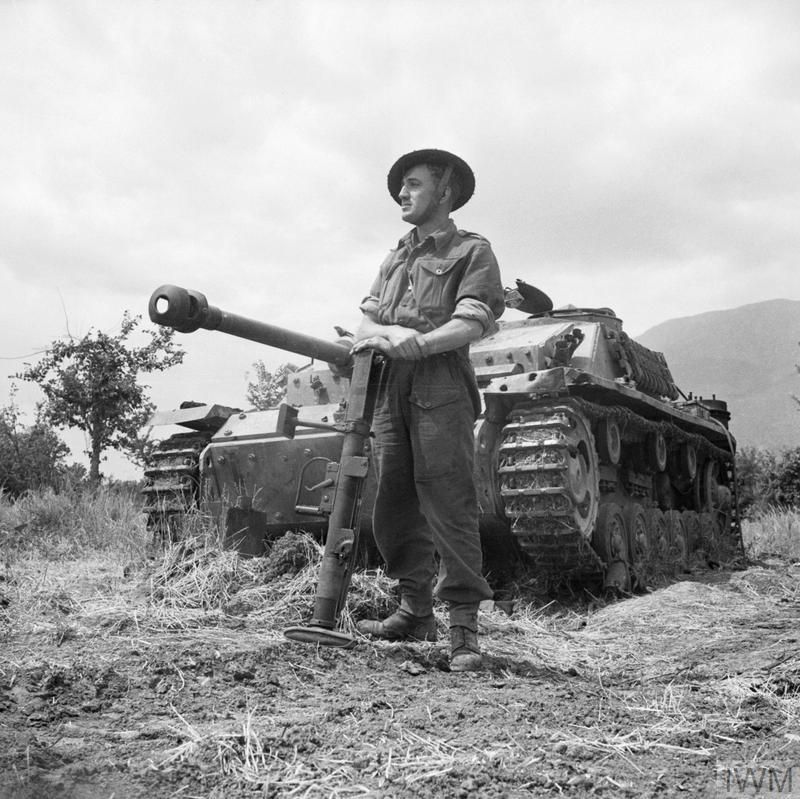 Below: Image IWM (NA 15430). Fusilier F Jefferson of C Company, 2 Bn Lancs Fusiliers, standing in front of a Stug II that he disabled with a PIAT anti tank weapon in Italy.