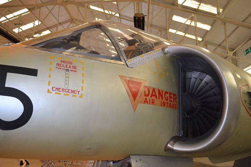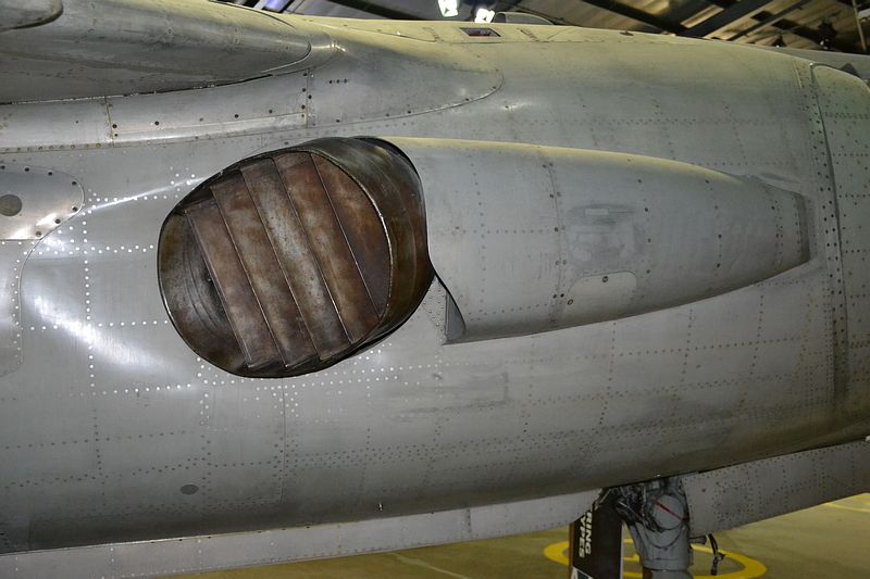 The engine air intakes are larger than a P.1127, much nearer to a Harrier, but angled back and flared out in the same way as the rubber P.1127 intakes (early Kestrels had the rubber intakes to start with) and without the rounded splitter plate (which isn't actually a splitter plate because it doesn't have a gap). There are no auxiliary intake doors around their outer edge.