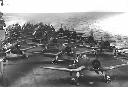 Perhaps the most capable of these aircraft was the remarkable Chance Vought Corsair. Based around the immensely powerful P&W Double Wasp rotary engine of 2,000 HP, the Corsair featured distinctive inverse gull wings that allowed the most efficient aerodynamic join between wing and fuselage whilst also shortening the length of undercarriage needed to keep the aircraft's huge propeller clear of the deck.